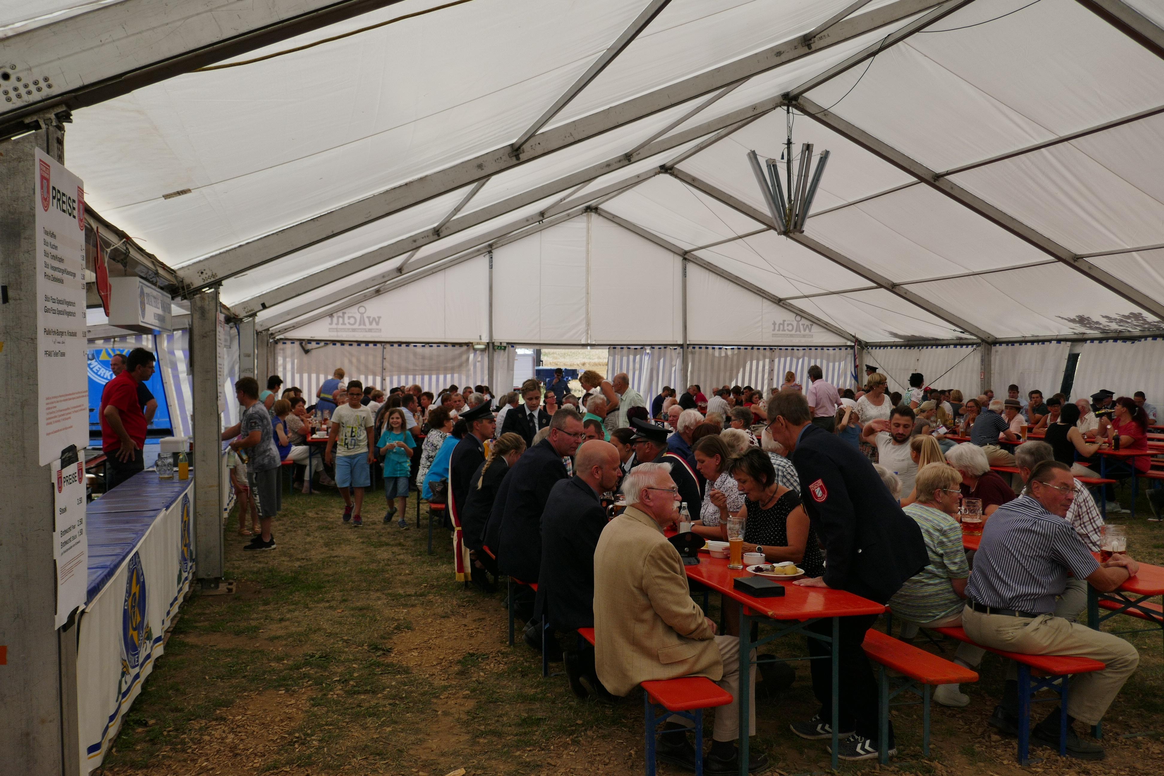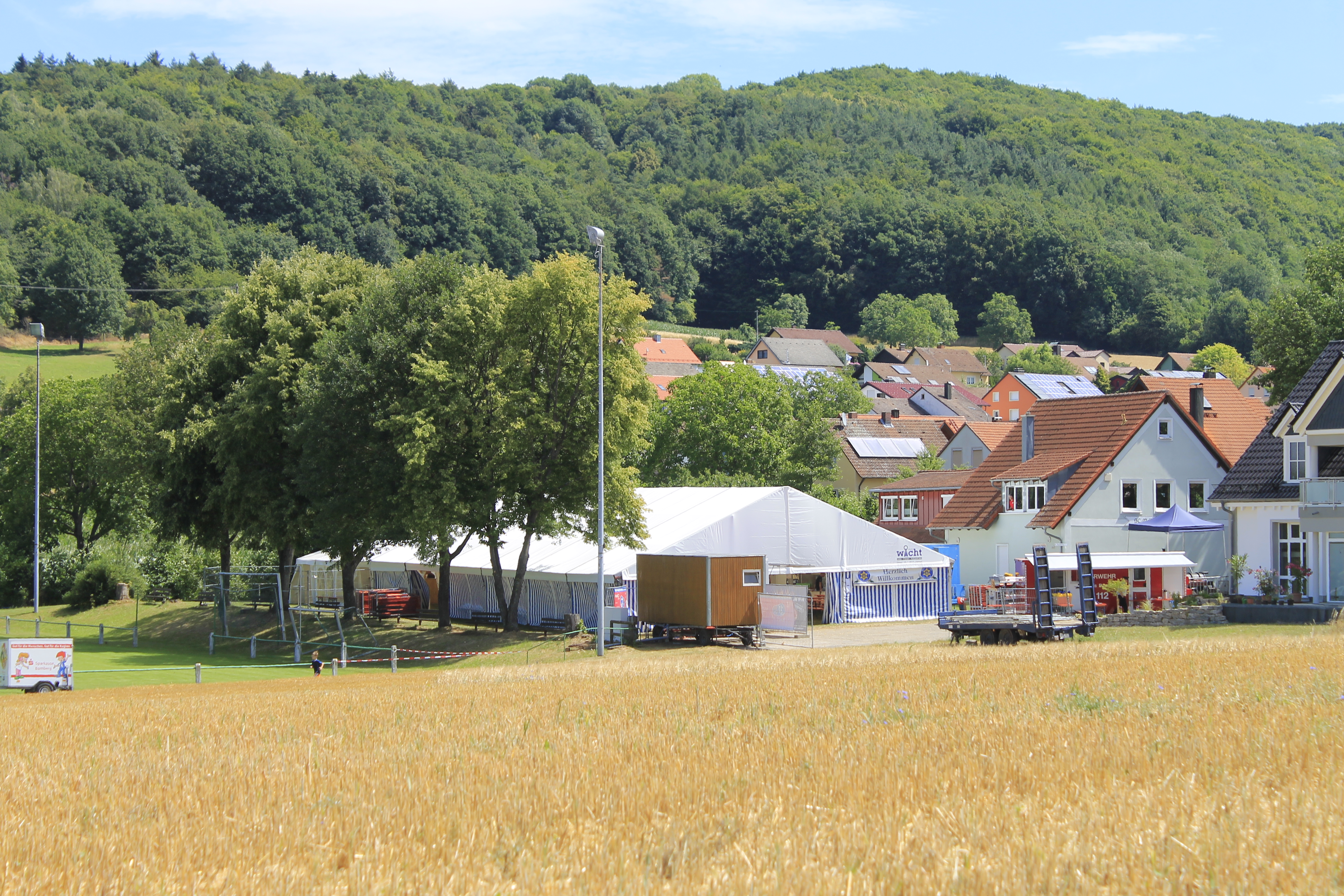Bereits am Dienstag begannen die Vorarbeiten. Am Mittwoch den 4. Juli war es dann soweit. Viele Helfer aus Melkendorf und Umgebung waren gekommen um beim Zeltaufbau zu helfen. Grillbude, Sanitärwagen, HALT-Mobil und die gesamte Inneneinrichtung im Festzelt wurden in zwei Tagen eingerichtet. Mitten in den Festvorbereitungen wurde die Feuerwehr Melkendorf am Donnerstag nach Kremmeldorf zu einem Brandgeschehen alarmiert. Hier erfuhr die neue Einsatzpumpe ihre „Feuertaufe“ und bewährte sich bestens.